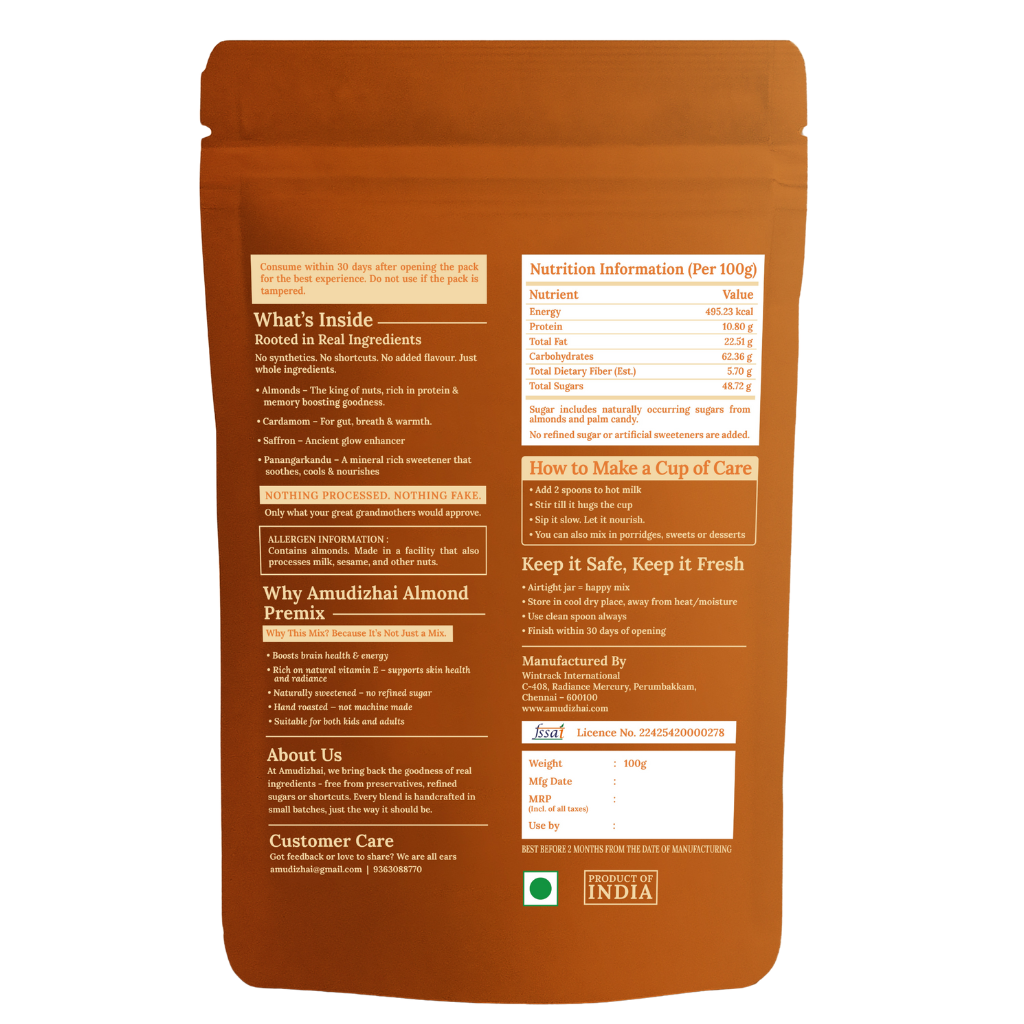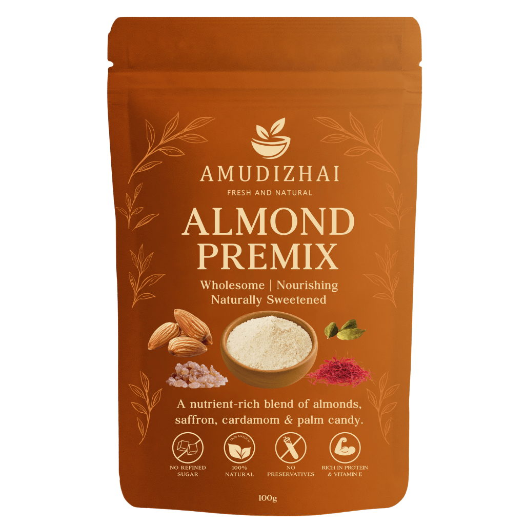 If you are looking for a nourishing, non dairy drink mix that is truly clean and rooted in tradition, Amudizhai’s Almond Milk Premix is made for you. Crafted with handpicked almonds, cooling palm candy, and the natural fragrance of cardamom and saffron, this mix is free from refined sugar, milk powder, or preservatives and 100% kid safe. Just mix with hot milk, stir, and sip the goodness of nature in every cup.